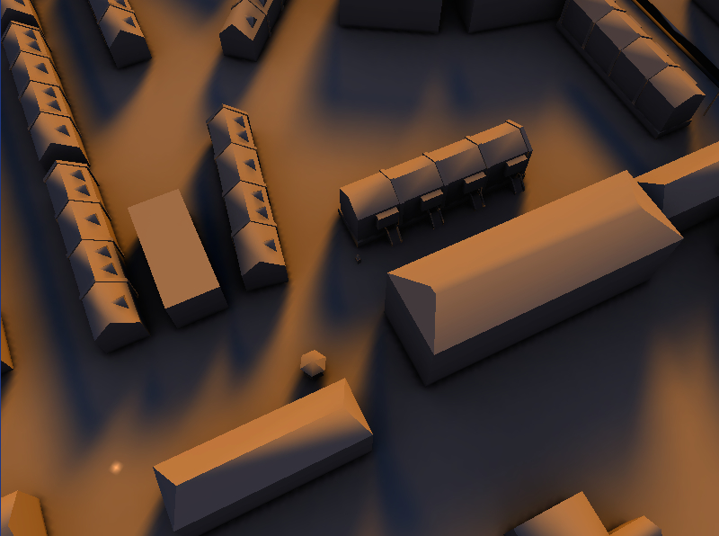 It is now part of the 3D city visualization tool LandXplorer by Autodesk. Calculating the light maps takes between a few seconds and a few minutes depending on the model size. (12s to generate 14 1024^2 textures for a 15k triangle model using 400 light sources on a Geforce 8600M 128MB notebook graphics card with Core Duo 2.2Ghz processor).